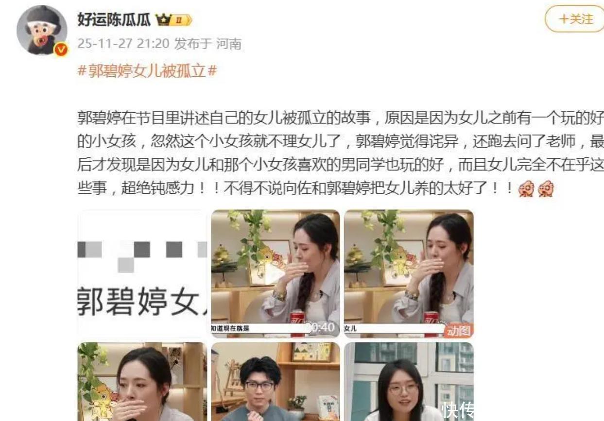 身为母亲,郭碧婷及时联系老师询问缘由,得知竟是女同学因暗恋同班男同学,嫉妒向芷与对方的互动,才做出疏远之举。这般孩童间的占有欲纠葛,让郭碧婷颇感意外,而向芷的反应更显从容 —— 她告诉妈妈,学校里有很多伙伴愿意和自己玩耍,压根没察觉被 “孤立”。 这份淡定,源于原生家庭给予的满满底气。向家恪守隔代不越权的育儿原则,全力支持郭碧婷的教育方式;郭碧婷不仅用个人收入抚养孩子,还通过收养流浪动物开展生命教育。在全家爱意与科学教育的滋养下,向芷拥有了强大的内心。