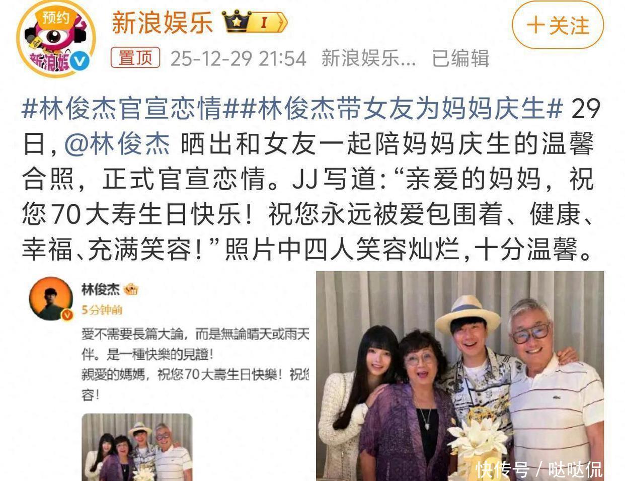 44岁的林俊杰昨天晚上正式公布了恋情。那天正好是他妈妈的生日,为了庆祝大家凑在一起,合照里四个人笑得特别开心,气氛也挺融洽。女方和他家人相处得挺好,甚至可以随意把手搭在林俊杰妈妈的肩膀上,种种细节都在传递着女方已经被家人认可,且得到了一定的见证。